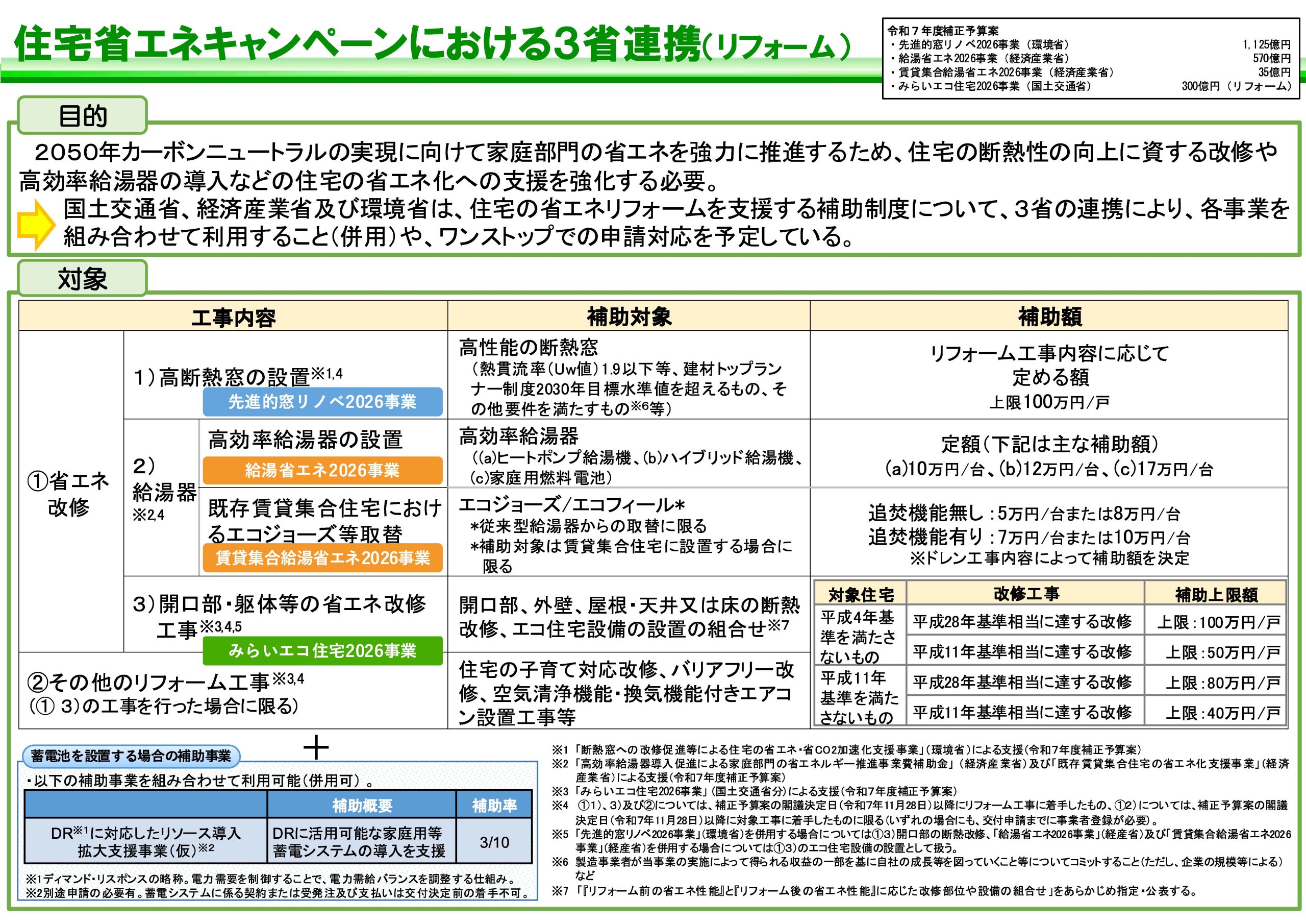 来年も2050年カーボンニュートラルの実現に向けて住宅の省エネ化の支援を強化するため、国土交通省、環境省及び経済産業省の連携による「住宅省エネ2026キャンペーン」の実施を通じて、「GX志向型住宅の新築」、「子育て世帯等を対象とする長期優良住宅・ZEH水準住宅の新築」、「住宅の省エネリフォーム等」で補助金の支援が発表されました。